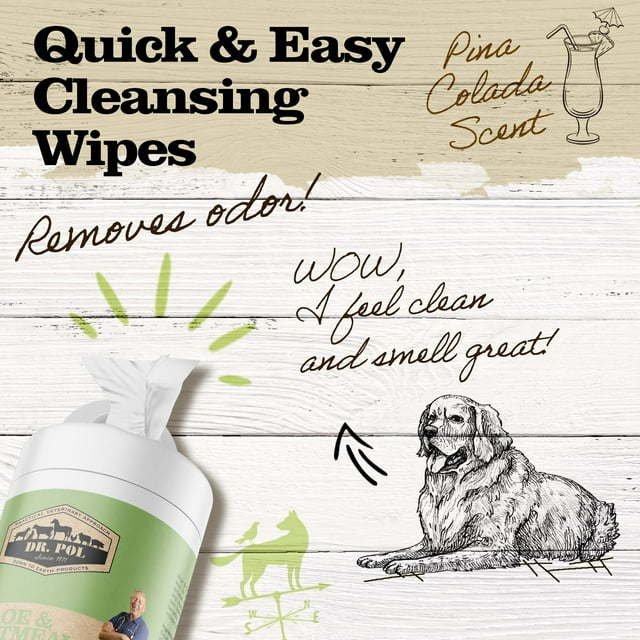 About Dr. Pol Aloe and Oatmeal Pet Wipes for Dogs and Cats Don't let pet smell bring you down! Keep your dog or cat smelling and feeling fresh between baths with Dr. Pol Aloe and Oatmeal Pet Wipes. These grooming wipes for dogs and cats are made with wholesome ingredients such as aloe vera and oatmeal to help nourish the skin and coat. These safe and effective kitten and puppy wipes can also aid in itch relief, removing cat dander, soothing dry skin, and deodorizing. Your stash of puppy or kitten supplies or your collection of dog grooming supplies should always include cat and dog cleaning wipes, which are especially great for dog travel when a bath might not be an option. When looking for cat or dog wipes deodorizing, nourishing ingredients are key; that's why these puppy and kitten wipes are safe for grooming and cleaning pets as young as 12 weeks old. The mild pina colada scent acts as a pet deodorizer, the wiping motion helps as a pet dander remover, and the soap-free formula helps cleanse the coat without cat or dog bathing. You can even use these as dog paw wipes or dog bath wipes for the messy pup, or as cat bath wipes for the water-avoiding kitty. Cat and dog anti itch products may contain irritants, but Dr. Pol veterinary formula dog and cat wipes help attack dog odor with a pleasant fruity scent. These bath wipes for cats and dogs make a great addition to your stash of pet supplies for dogs and cats, and they're sure to delight both you and your furry friend with wholesome and effective ingredients!