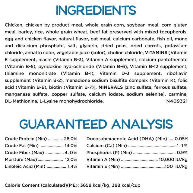 Bite-size Purina puppy food is sized for their small puppy mouth and manufactured with accents of real peas and carrots